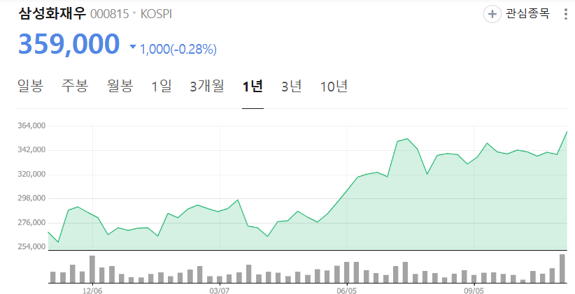 2025년 10월 현재 삼성화재우의 주가는 약 360,000원 수준입니다.