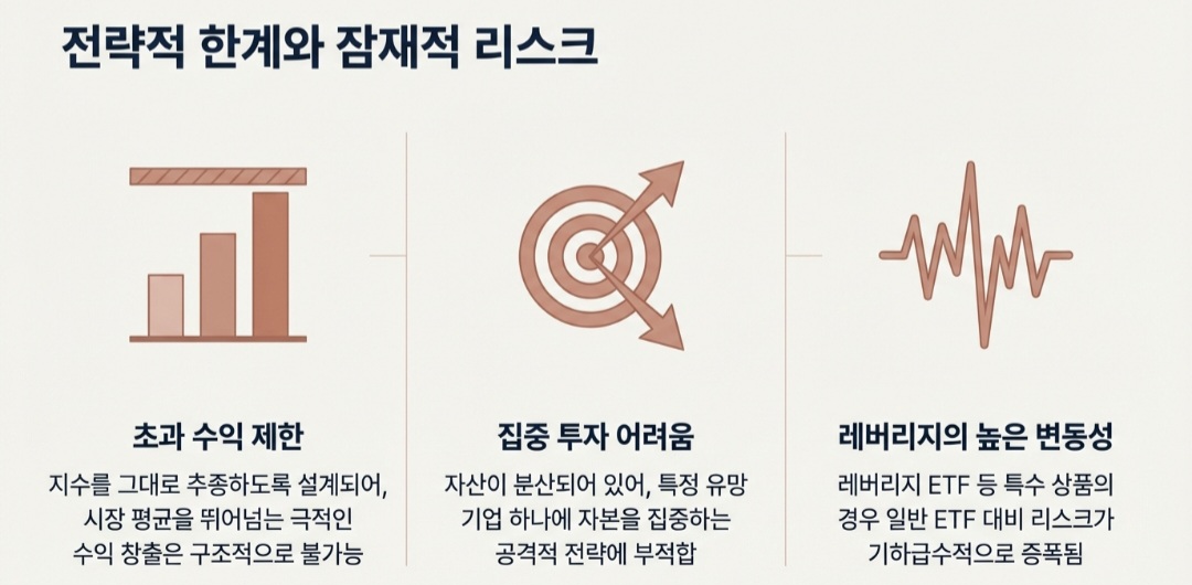 반면 단점도 존재합니다. 지수를 그대로 추종하기 때문에 특정 종목이 급등해도 수익이 제한될 수 있습니다. 또한 레버리지 ETF나 인버스 ETF는 변동성이 매우 크기 때문에 장기 투자에는 부적합할 수 있습니다. ETF는 안정적인 투자 수단이지만 상품 유형에 따라 위험 수준이 크게 달라집니다.
