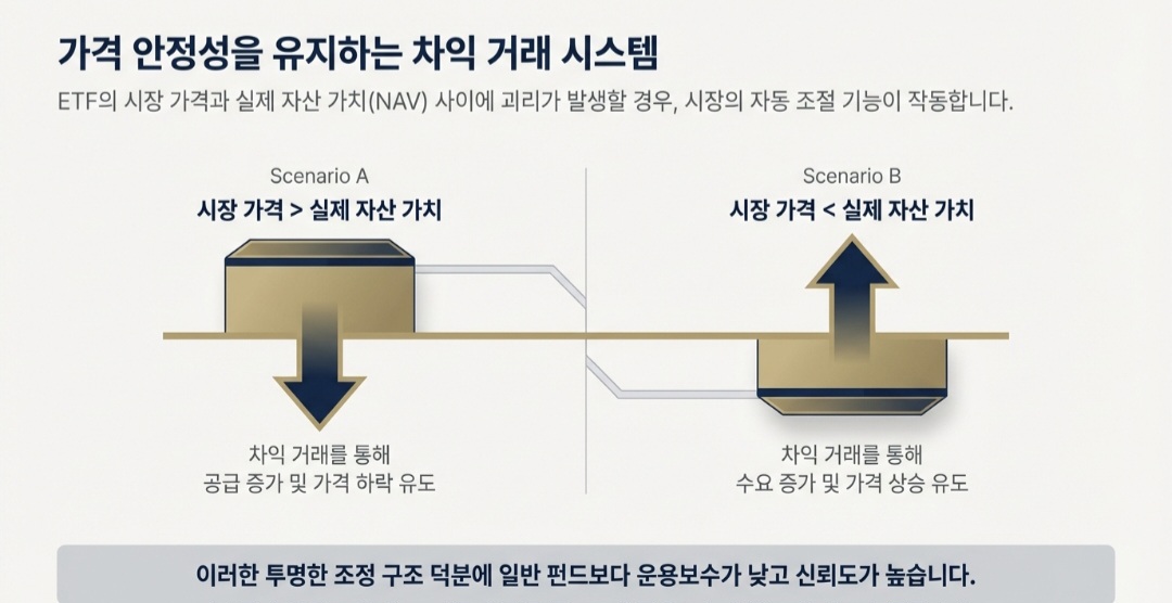 만약 시장 가격과 실제 자산 가치 사이에 차이가 발생하면 유동성 공급자(LP)가 차익 거래를 통해 가격을 조정합니다. 이 과정 덕분에 ETF 가격은 비교적 안정적으로 지수와 비슷한 흐름을 유지합니다. 또한 ETF는 설정과 환매가 가능해 수요가 늘어나면 추가 발행이 이루어지고, 수요가 줄어들면 환매를 통해 물량이 조정됩니다. 이런 구조는 일반 공모펀드보다 투명성이 높고 운용보수가 낮다는 장점을 만들어냅니다.