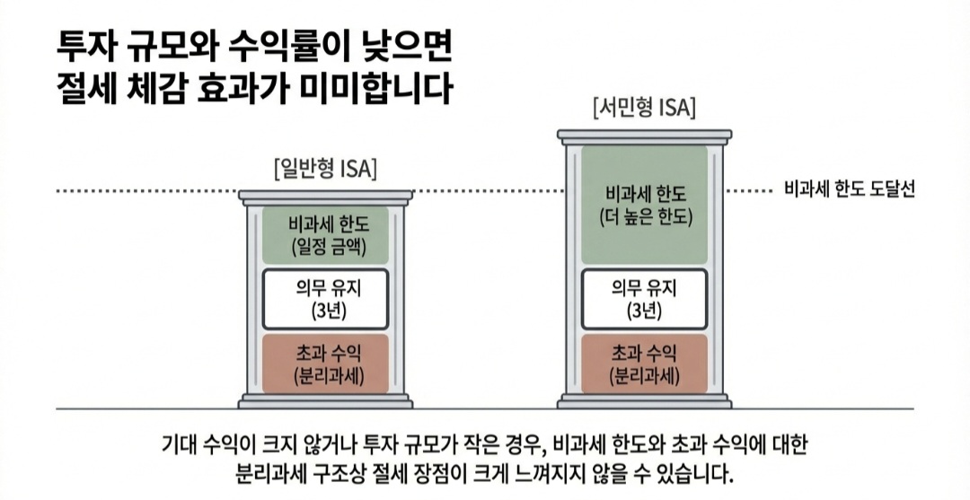 투자 규모와 수익률이 낮다면 ISA계좌의 절세 장점이 크게 느껴지지 않을 수 있습니다.
