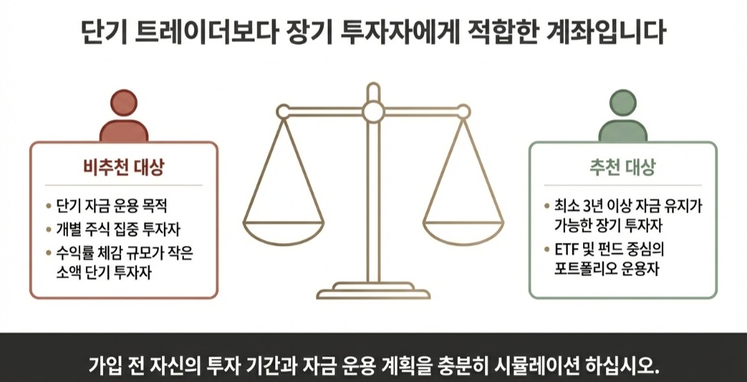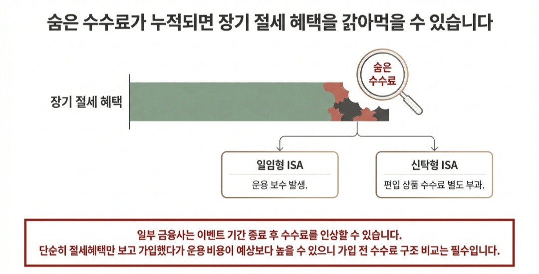수수료가 따로 부과됩니다. 장기 투자 시 수수료 차이는 누적 수익률에 영향을 줄 수 있습니다. 또한 일부 금융사는 이벤트 기간 이후 수수료가 인상될 수 있습니다. 단순히 절세 혜택만 보고 가입했다가 운용 비용이 예상보다 높을 수 있습니다. 가입 전 반드시 수수료 구조를 비교해야 합니다.