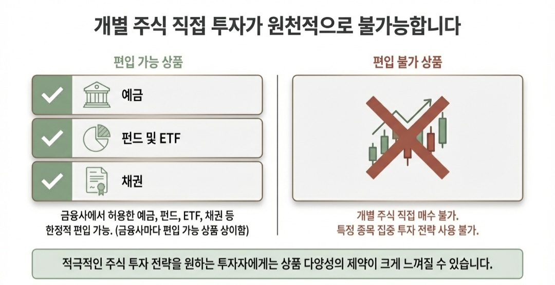 ISA계좌 단점으로 자주 언급되는 부분은 투자 상품의 제한입니다. 모든 금융상품을 자유롭게 편입할 수 있는 것이 아니라, 금융사에서 허용한 예금, 펀드, ETF, 채권 등으로 한정됩니다. 개별 주식 직접 투자는 불가능합니다.